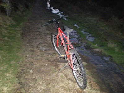 O pior deste passeio de Natal não foi a subida, foi mesmo a descida. Resolvi, por volta das 18h, ir por um outro caminho para casa, um caminho que não conhecia, o que resultou em perder-me completamente de onde estava, e com a noite a aparecer. Esta fotografia da bicicleta foi tirada no início da descida, junto àquilo que me parecia uma fonte.
